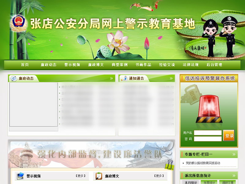 提供了廉政動(dòng)態(tài)、通知通告、警示視頻、廉政博文、典型案例、書畫作品、經(jīng)驗(yàn)交流、專項(xiàng)活動(dòng)、法律法規(guī)、重要文件等10個(gè)欄目,展示各種類型的圖文警示信息。