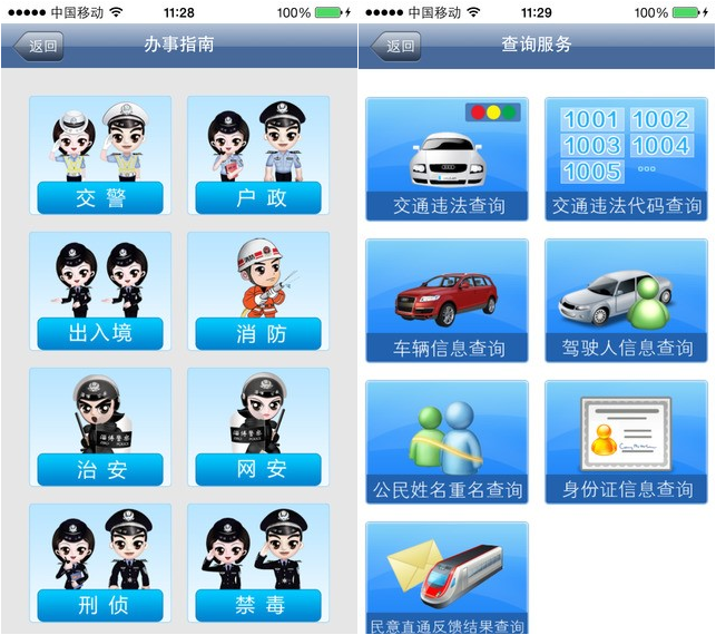 提供交通違法查詢、交通違法行為代碼查詢、車輛信息查詢、駕駛?cè)诵畔⒉樵?、公民姓名重名查詢、身份證信息查詢、民意直通反饋結(jié)果查詢。